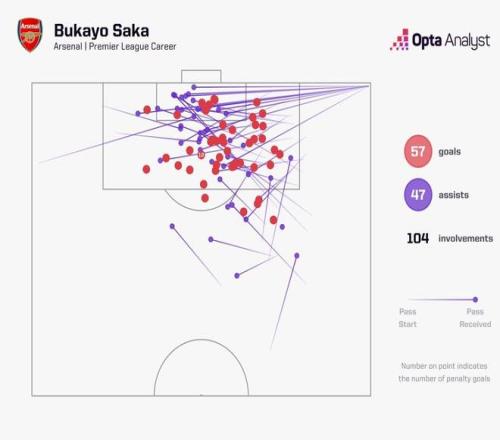 參與104球超越皮雷,薩卡升至阿森納隊(duì)史英超參與進(jìn)球榜第七